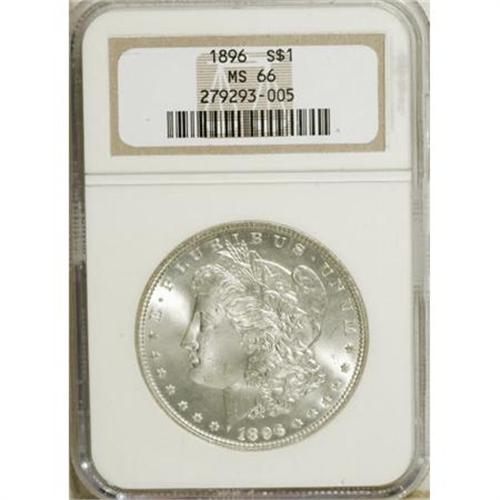 <B>1896 $1 MS66 NGC.</B></I> NGC Census: (551/44). PCGS Population (606/23). Mintage: 9,976,762. Numismedia Wsl. Price for NGC/PCGS coin in MS66: $460. (#7240)<BR><BR><B>Coin Engraver:</B> George T. Morgan<BR><BR><b>Shipping:</b> Coins & Currency (<a target="_blank" href="http://www.heritageauctions.com/common/shipping.php">view shipping information</a>)
