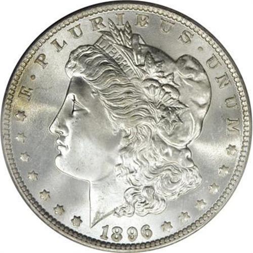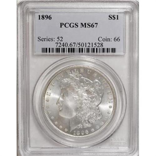 <B>1896 $1 MS67 PCGS.</B></I> The 1896 Morgan dollar was a well produced issue that has seen many Mint State survivors from MS60 though MS65. At MS66 the 1896 becomes a bit scarcer, and at MS67 this issue is comparatively rare. As of December 2007, only 68 examples have received an MS67 rating from NGC and PCGS together, two of those in MS67 Prooflike; with none graded any higher. This Superb Gem is sharply struck and exquisitely preserved, with ebullient luster and bright, white surfaces that only show hints of gold patina on either side. Surface marks are minimal. PCGS Population: 23 in 67, 0 finer (12/07).<BR><I>From The Motor City Collection.</B></I><BR><BR><B>Coin Engraver:</B> George T. Morgan<BR><BR><b>Shipping:</b> Coins & Currency (<a target="_blank" href="http://www.heritageauctions.com/common/shipping.php">view shipping information</a>)