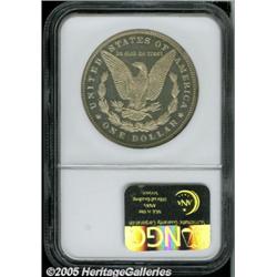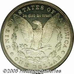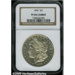 <B>1896<img border='0' src='http://www.heritagecoins.com/images/star.gif' width=10 height=10>$1 PR66 Cameo NGC.</B></I> This is a lovely Cameo Proof with wisps of champagne toning on both sides, especially on the reverse. Deep ebony toning is confined to a portion of the obverse border. The obverse has light contrast and the reverse has deeper contrast.