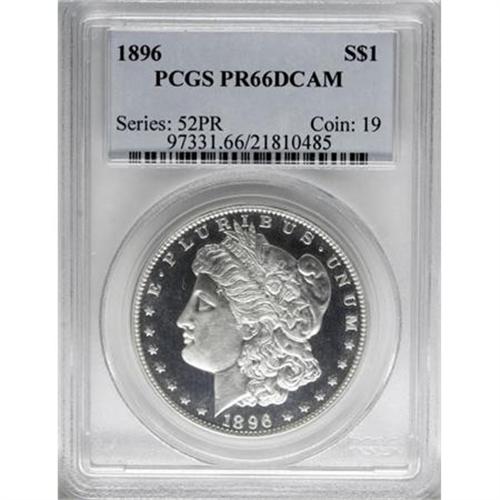 <B>1896 $1 PR66 Deep Cameo PCGS.</B></I> The proof Morgan dollars of 1896 show the Mint at the peak of quality during the lifetime of the series, and collectors assembling a proof type set often turn to the issue. In his <I>A Guide Book of Morgan Silver Dollars</B></I>, Q. David Bowers (2005) offers uncommonly phrased praise for such specimens: "Good strike. Deep cameo contrast. Some nice ones are around. Whew! Those nasty years of weak striking, beginning in 1888, are over!"<BR> The boldly defined and beautifully frosted devices, in conjunction with the minimally toned and fathomless obverse fields, shows that this example is no exception to the rule. The reverse's delicate silver-gray patina in no way impedes the contrast on that side, and the overall preservation is wonderful. An exquisite 19th century proof. Population: 9 in 66 Deep Cameo, 3 finer (10/07).<BR><BR><b>Shipping:</b> Coins & Currency (<a target="_blank" href="http://www.heritageauctions.com/common/shipping.php">view shipping information</a>)