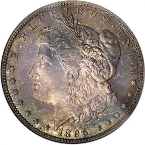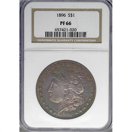 <B>1896 $1 PR66 NGC.</B></I> Deep red, gray, and cobalt-blue colors adorn the obverse, while the reverse shows a similar, but slightly deeper appearance. Well struck, and immaculate save for one small thin mark on the eagle's breast. From a scant mintage of just 762 pieces, considerably less than the legendary proof issue from the previous year. Population: 21 in 66, 24 finer (10/07).<BR><BR><B>Coin Engraver:</B> George T. Morgan<BR><BR><b>Shipping:</b> Coins & Currency (<a target="_blank" href="http://www.heritageauctions.com/common/shipping.php">view shipping information</a>)