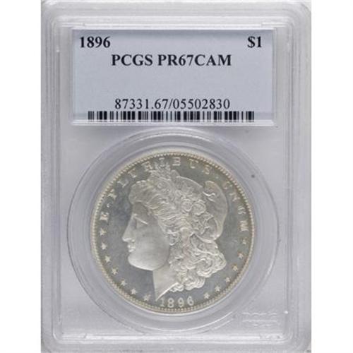 <B>1896 $1 PR67 Cameo PCGS.</B></I> Of the 27 proof Morgan dollar issues (1878 through 1904), only eight dates have a lower mintage than the 1896, of which 762 pieces were struck for collectors. Even the heralded 1895 proof Morgan dollar saw a higher production. The combined total of 1896 dated proofs graded at NGC and PCGS is 521 coins (6/07), which is indicative of a high survival rate for this issue. However, that total includes all proof dollars, regardless of the quality of manufacture and/or post-mint impairments. As specialists of this series know, many proofs were mishandled through poor storage choices and improper cleaning. The current coin resides in the upper echelon of all extant examples, as established by the current PCGS population of two in 67 Cameo with none finer (6/07). The PCGS <I>Population Report</B></I> has changed little in recent years for the 1896 proof Morgan dollar and it is unlikely that any new examples will be graded at this lofty level or higher, barring a chance upgrade of one of the few PR66 examples.<BR> As expected, this proof is almost perfectly preserved. The fields are deeply mirrored and the devices display heavy mint frost which gives the coin a stark cameo contrast on each side. Both obverse and reverse have an overlay of pale rose-gray patina. Exceptional quality. <BR> <BR><BR><b>Shipping:</b> Coins & Currency (<a target="_blank" href="http://www.heritageauctions.com/common/shipping.php">view shipping information</a>)