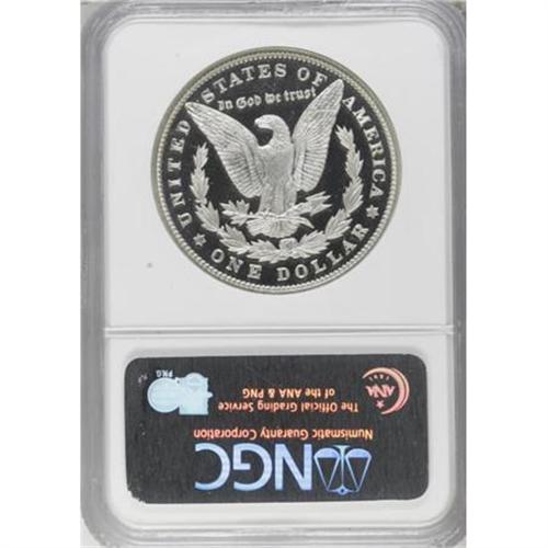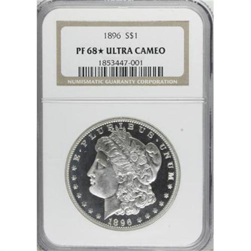 <B>1896 $1 PR68 </B></I> S<B> Ultra Cameo NGC.</B></I> <B>1896 S$1 PR68 <img border='0' src='http://www.heritagecoins.com/images/star.gif' width=10 height=10> Ultra Cameo NGC.</B></I> After several years of sparse P-mint emissions, the Morgan dollar came roaring back in 1896, to the tune of nearly 10 million business strikes, along with about 5 million pieces each in New Orleans and San Francisco. The proof mintage was typical for the era, at 762 specimens. The 20 million examples of the 1896 Morgan dollar joined the hundreds of millions of earlier Morgan dollars in Treasury vaults, unwanted by the public, unneeded in commerce, undesired by the government, yet mandated by the inflexible terms of the Bland-Allison Act of 1878, a sop to the Western mining interests and domestic banks that had grown considerably in power in the intervening years since the "Crime of '73."<BR> The year 1896 was notable for another event in the life of the Morgan dollar (or the Bland dollar, as it was almost universally called throughout its lifetime). 1896 was the year that Miss Anna Williams, the model for the head of Liberty on the coin, married her husband. Mint Director Henry Richard Linderman, who was of the opinion that U.S. coinage designs were unacceptable, offered designer George T. Morgan, an Englishman and former student of A.B. Wyon, a job as assistant engraver at the Philadelphia Mint in 1876, although both Mint Chief Engraver William Barber and his son Charles strongly--and unsurprisingly--resisted the appointment. Morgan came to America that same year and was enlisted to design a new silver dollar. His friends directed him toward the classic beauty of Miss Williams, and when he first approached her, like most proper ladies of the time, she immediately turned him down. <I>Her</B></I> friends interceded, however, and she relented, agreeing to pose. Apparently Miss Williams "kept her looks" well, as she married nearly 20 years later, in 1896.<BR> The year 1896 was an especially kind one for Morgan dollar proofs, and for this particular specimen as well. While only a couple of dozen proofs have been certified as fine as this piece at NGC, that service has certified four 1896 dollars in PR68 Star Ultra Cameo, including the present example, and only one PR69 <img border='0' src='http://www.heritagecoins.com/images/star.gif' width=10 height=10> coin (6/07). The coin is brilliant silver-white, without detectable patina, and stunning silver-on-black, deeply contrasting surfaces. Perusal even under a loupe reveals only surface minutiae unworthy of singular mention. Simply a phenomenal and phenomenally attractive piece.<BR><BR><b>Shipping:</b> Coins & Currency (<a target="_blank" href="http://www.heritageauctions.com/common/shipping.php">view shipping information</a>)
