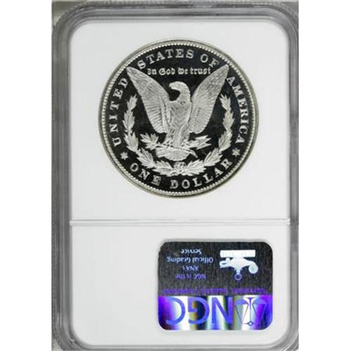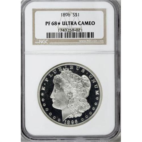 <B>1896 $1 PR68 </B></I><img src="/images/star.gif" width="10" height="10" alt="" border="0"><B> Ultra Cameo NGC.</B></I> Over the decades, the proof Morgan dollars of 1896, along with those of the following two years, have acquired a wholly deserved reputation for excellent eye appeal and overall quality. Perhaps the most elegant summation of the issue's traits comes from Wayne Miller's work, <I>The Morgan and Peace Dollar Textbook</B></I>. In his entry for the proof 1896 issue, he wrote: "The proofs from 1896-1898 evidence the most awesome cameo contrast of any of the proof Morgans. Special care seems to have been taken during these years to maximize the depth of the mirror fields, and the whiteness of the devices."<BR> This potential for spectacular eye appeal, however, comes at a price; many examples show evidence of contact or fine flaws in the fields, an occurrence common to the proof Morgan series as a whole. Miller tempers his glowing assessment of the 1896 proofs with a warning, nothing that " ... the depth of the mirror fields and the purity of the devices exaggerates any hairlines and thus the 1896 is somewhat difficult to locate in fully [G]em proof condition."<BR> No such concerns exist with this spectacular representative. Even under magnification, one is hard-pressed to identify even tiny flaws. Just a trace of champagne patina visits the obverse rims, and the fathomless fields are otherwise untoned. The meticulously struck, richly frosted devices combine with the mirrors for spectacular contrast that would make this coin stand out in any environment. In sum, this is a stunning exemplar that would be a credit to any collection. Census: 4 in 68 <img src="/images/star.gif" width="10" height="10" alt="" border="0"> Ultra Cameo, 3 finer (12/07).<BR><BR><b>Shipping:</b> Coins & Currency (<a target="_blank" href="http://www.heritageauctions.com/common/shipping.php">view shipping information</a>)