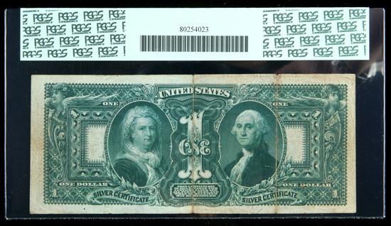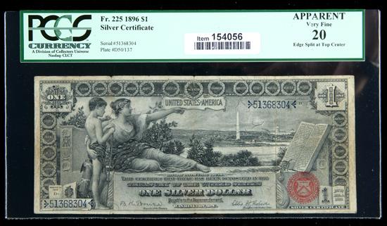 1896, $1 Silver Certificate. PCGS Apparent Very Fine 20. . Fr-225. . KL-39. There is a quarter-inch split in the top edge at the center of the note, otherwise this is an exceptional Educational ace for the grade.