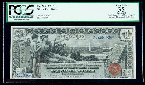 1896, $1 Silver Certificate. PCGS Apparent Very Fine 35. . Fr-225. A lovely example with just a number of folds, although some small edge tears and minor repairs are mentioned by PCGS Currency.