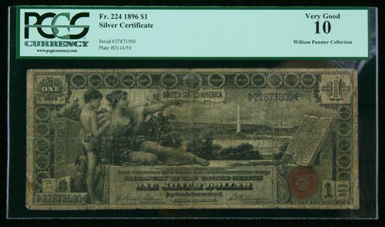 1896, $1 Silver Certificate. PCGS Very Good 10. . Fr-224. Heavily circulated but free of any serious flaws.