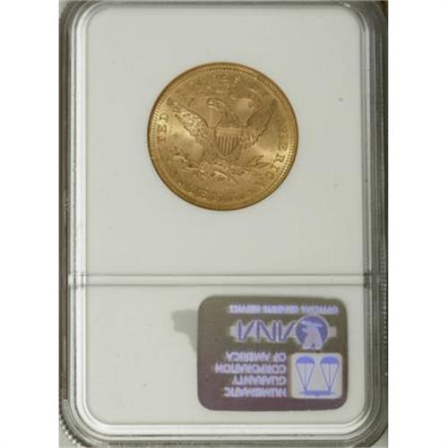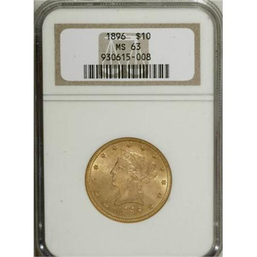 <B>1896 $10 MS63 NGC.</B></I> The yellow-orange surfaces have rich luster and well-defined devices. The mintage is low for a later Philadelphia issue. Only 76,270 pieces were struck.<BR><BR><b>Shipping:</b> Coins & Currency (<a target="_blank" href="http://www.heritageauctions.com/common/shipping.php">view shipping information</a>)