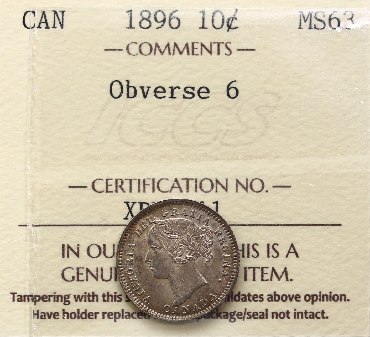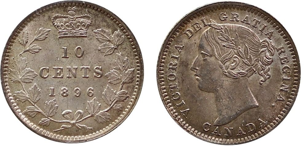 1896 10¢ "Obv.6" ICCS Choice Mint State-63 Light and attractive tone over full underlying lustre.