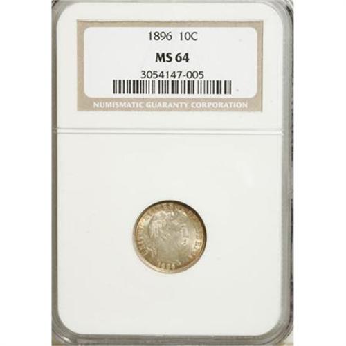 <B>1896 10C MS64 NGC.</B></I> NGC Census: (23/26). PCGS Population (24/23). Mintage: 2,000,762. Numismedia Wsl. Price for NGC/PCGS coin in MS64: $560. (#4809)<BR><BR><B>Coin Engraver:</B> Charles E. Barber<BR><BR><b>Shipping:</b> Coins & Currency (<a target="_blank" href="http://www.heritageauctions.com/common/shipping.php">view shipping information</a>)