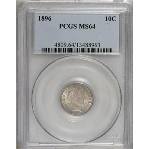 <B>1896 10C MS64 PCGS.</B></I> PCGS Population (24/23). NGC Census: (24/25). Mintage: 2,000,762. Numismedia Wsl. Price for NGC/PCGS coin in MS64: $560. (#4809)<BR><BR><B>Coin Engraver:</B> Charles E. Barber<BR><BR><b>Shipping:</b> Coins & Currency (<a target="_blank" href="http://www.heritageauctions.com/common/shipping.php">view shipping information</a>)