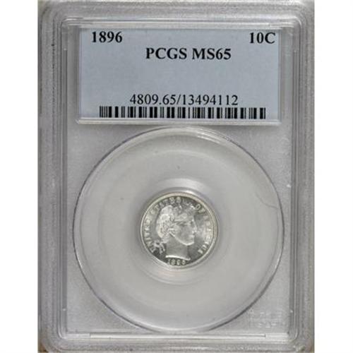 <B>1896 10C MS65 PCGS.</B></I> A crisply struck silver-white Gem that offers a hint of reflectivity in the fields. The unmarked devices show a hint of frost as well. Population: 12 in 65, 9 finer (7/07).<BR><BR><B>Coin Engraver:</B> Charles E. Barber<BR><BR><b>Shipping:</b> Coins & Currency (<a target="_blank" href="http://www.heritageauctions.com/common/shipping.php">view shipping information</a>)