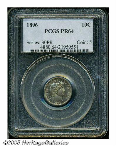 <B>1896<10C> PR64 PCGS.</B></I> Sharply struck and deeply toned with exceptional eye appeal for the grade. Both sides exhibit lovely iridescent toning. Just a few of the faintest hairlines keep this from Gem quality.