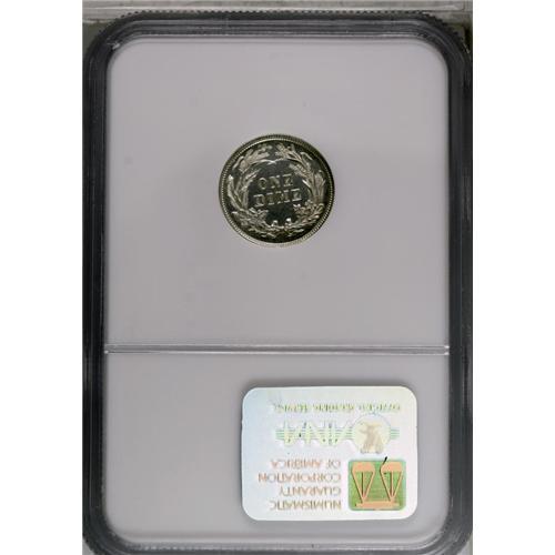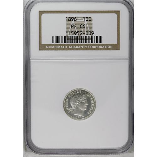 <B>1896<10C> PR66 NGC.</B></I> A light cameo-effect is apparent on this beautiful Barber dime that is nearly untoned save for some light milky speckles on the reverse, and that has sharply struck design elements. No significant marks are to be found on this magnificent specimen. Census: 47 in 66, 12 finer (6/06).