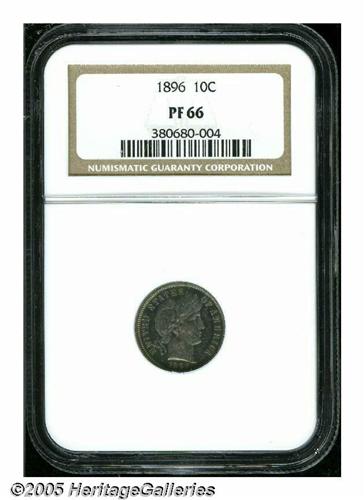 <B>1896<10C> PR66 NGC.</B></I> Mottled teal, indigo and violet surfaces, and good underlying luster. The few flaws this Premium Gem does have are barely noticeable as should be expected.