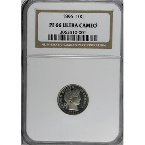 <B>1896 10C PR66 Ultra Cameo NGC.</B></I> A flashy and faintly toned Premium Gem with obvious contrast between the pearl-gray devices and the glassy fields. A wonderful souvenir from the year of William Jennings Bryan's famous "Cross of Gold" convention speech. A scant 762 pieces were struck. Census: 1 in 66 Ultra Cameo, 1 finer (8/07).<BR><BR><b>Shipping:</b> Coins & Currency (<a target="_blank" href="http://www.heritageauctions.com/common/shipping.php">view shipping information</a>)
