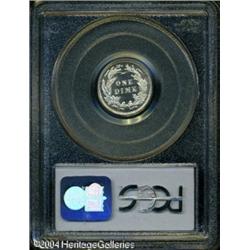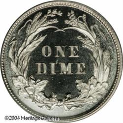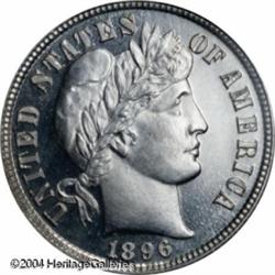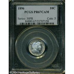 1896 10C PR67 Cameo PCGS. Proof silver coinage fro <B>1896 10C PR67 Cameo PCGS.</B></I> Proof silver coinage from the late 1890s is among the most meticulously produced in the Barber series. Therefore, it is not too surprising that more than a few specimens receive the cameo designation from the grading services. This glittering, untoned beauty not only exhibits enviable contrast, but it looks very much as it obviously did when it left the Philadelphia mint more than a century ago. There are no distractions worthy of mention on this near-impeccable proof. Population: 3 in 67 Cameo, 0 finer (10/04). <BR><BR><B>Important notice:</B> Heritage usually auctions material at the rate of 200-250 lots per hour. On some occasions eBay Live bid software or the Internet may not be able to keep up with the pace of the auction. We recommend placing a realistic absentee bid now as insurance to avoid disappointment. Occasionally the auctioneer may eliminate or reject an eBay Live bid, and the auctioneer may also reopen a lot after the close of the eBay live bidding (usually because we missed an audience bid), and may reject your bid even if it shows you as the winning bidder. By bidding via eBay Live, you agree that Heritage may award the lot to another bidder at its sole discretion under the circumstances described above or any other reasonable circumstances. Since eBay bids are not shown to us until we open the lot on the floor, we treat those bids just like floor bids. In most cases the floor responds before the eBay bid is presented to us, due to Internet lag time, so for consistency we have made it a policy that floor bids are always considered first over tie eBay live bids. Also please note that all Heritage lots purchased through eBay Live carry a 20% Buyer's Premium. Please make sure you read the Terms and Conditions before you bid. This lot is being auctioned in conjunction with a live floor auction by Heritage Galleries & Auctioneers. All final auction and invoice information will be supplied by Heritage Galleries & Auctioneers, and all other information should be considered preliminary. Lot:5787
