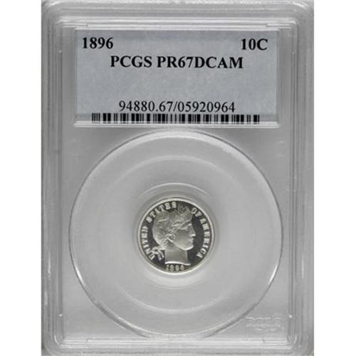 <B>1896 10C PR67 Deep Cameo PCGS.</B></I> An uncommonly delightful representative of this early proof Barber dime issue, boldly impressed with stellar contrast and in a grade previously unknown to PCGS for Deep Cameo pieces (7/07). The silver-white obverse offers exceptional reflectivity in the fields, and the reverse shines just as brightly through a thin veil of milky patina that barely dims the contrast on that side. Carefully preserved and an all-around outstanding specimen.<BR><BR><b>Shipping:</b> Coins & Currency (<a target="_blank" href="http://www.heritageauctions.com/common/shipping.php">view shipping information</a>\)
