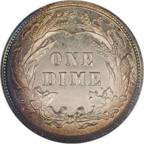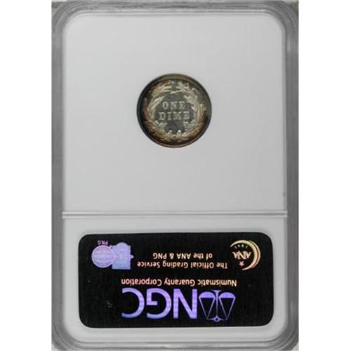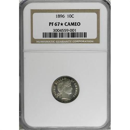 <B>1896 10C PR67 <img border='0' src='http://www.heritagecoins.com/images/star.gif' width=10 height=10> Cameo NGC.</B></I> Gold, rose-red, and cobalt-blue enrich the peripheries of this exactingly struck Superb Gem. Icy motifs contrast with the seamless mirrored fields. As of (8/07), NGC has awarded star designations to three proof 1896 dimes, two as PR66 <img border='0' src='http://www.heritagecoins.com/images/star.gif' width=10 height=10> Cameo and the present piece as the single finest.<BR><BR><b>Shipping:</b> Coins & Currency (<a target="_blank" href="http://www.heritageauctions.com/common/shipping.php">view shipping information</a>)