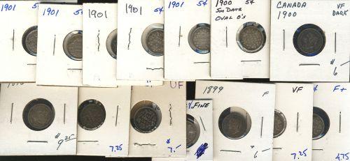 1896, 1899 (6), 1900 "Oval" (3), 1901 (5). Grades are F-12 or better. Lot of 15 pieces.