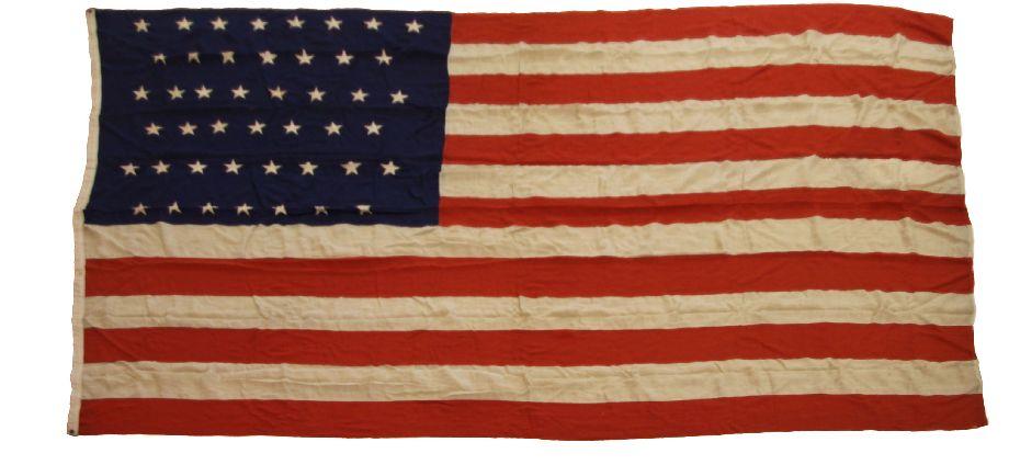Cotton 8x12 foot United States flag featuring 45 stars (1896-1908). All cotton with sewn stripe panels and stars. Very good condition with metal grommets intact minor material breakdown near fly and a few moth holes in body.