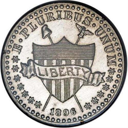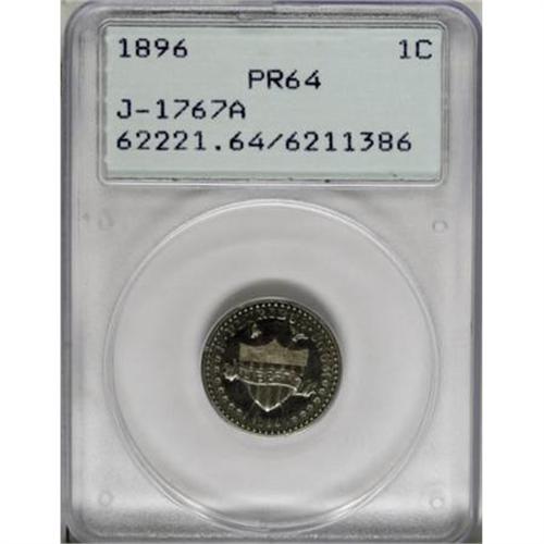 <B>1896 1C One Cent, Judd-1767a, Pollock-1981, Low R.7, PR64 PCGS.</B></I> A proposed departure from tradition. Instead of a depiction of Liberty, the obverse displays a shield in front of crossed poles topped by a liberty cap and eagle. A banner inscribed LIBERTY overlies the shield. The reverse is simply laid out with the denomination in the center, an olive wreath around, and UNITED STATES OF AMERICA at the margin. Struck in pure nickel with a plain edge. A well struck slate-gray near-Gem with a smooth satiny appearance. In a first generation holder.<BR><BR><b>Shipping:</b> Coins & Currency (<a target="_blank" href="http://www.heritageauctions.com/common/shipping.php">view shipping information</a>)