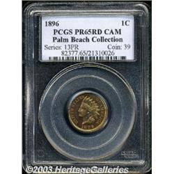 1896 1C PR65 Red Cameo PCGS. Less discerning collectors should have little trouble acquiring a Brown or Red and Brown representative of this issue. Even lower grade Red survivors can be obtained with a little patience. At or above the PR65 Red level, however, the 1896 is undeniably rare. Flickers of golden-red color adorn the otherwise golden surfaces of this fully lustrous specimen. The crisp, shimmering features leave little doubt about this coin's status as a cameo proof. This is the finest Gem Cameo specimen thus far certified at either service (10/03).From the Palm Beach Collection. Important notice: Heritage usually auctions material at the rate of 200-250 lots per hour. On some occasions eBay Live bid software or the Internet may not be able to keep up with the pace of the auction. We recommend placing a realistic absentee bid now as insurance to avoid disappointment. Occasionally the auctioneer may eliminate or reject an eBay Live bid, and the auctioneer may also reopen a lot after the close of the eBay live bidding (usually because we missed an audience bid), and may reject your bid even if it shows you as the winning bidder. By bidding via eBay Live, you agree that Heritage may award the lot to another bidder at its sole discretion under the circumstances described above or any other reasonable circumstances. Also please note that all Heritage lots purchased through eBay Live carry a 20% Buyer's Premium. Please make sure you read the Terms and Conditions before you bid.