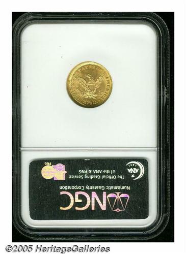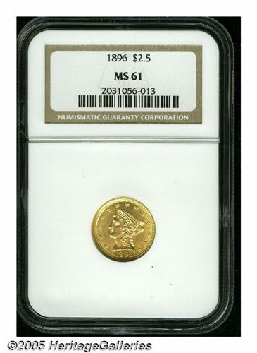 <B>1896<$2 1/2> MS61 NGC.</B></I> The design features are well struck and with good luster and moderately abraded surfaces that display brassy-gold patina. While not a rarity, the low mintage of 19,202 pieces ensures that this issue will never be common.