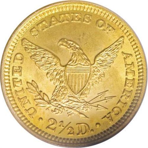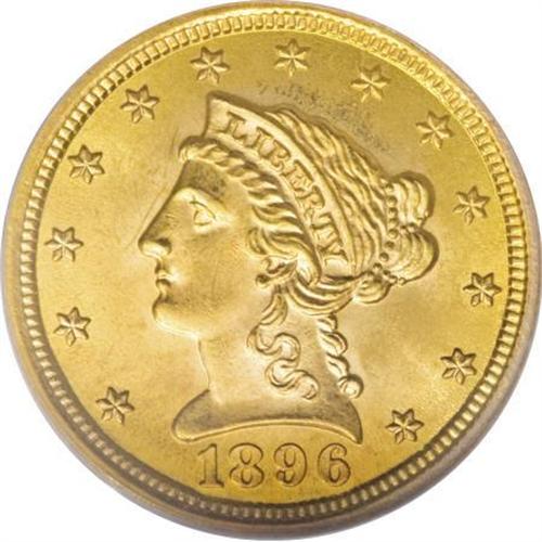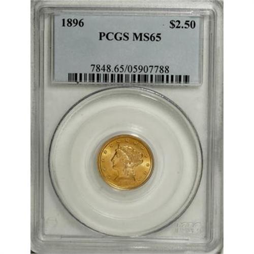 <B>1896 $2 1/2 MS65 PCGS.</B></I> Amazing surfaces with brilliant lemon-yellow color and strong design elements on both sides. While the date usually comes nicely struck, this example is particularly sharp, with full borders and central details. It ranks among the better known examples, with a limited population of higher grade pieces. Population: 54 in 65, 20 finer (8/07).<BR><BR><B>Coin Engraver:</B> Christian Gobrecht<BR><BR><b>Shipping:</b> Coins & Currency (<a target="_blank" href="http://www.heritageauctions.com/common/shipping.php">view shipping information</a>)