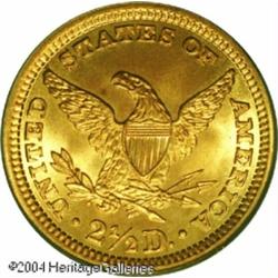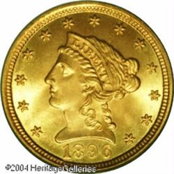 1896 $2 1/2 MS67 PCGS. A dazzling, fully struck Su <B>1896 $2 1/2 MS67 PCGS.</B></I> A dazzling, fully struck Superb Gem with mint-green peripheral toning and deeper orange-red coloration near the centers. Not even a tiny handling mark or planchet defect seems evident, on either the obverse or the reverse, under close inspection with a magnifier. This is a lower mintage date, with only 19,070 pieces struck for circulation, and the currently offered coin is one of only two examples to be graded at MS67 by PCGS, with none finer (11/04). A truly remarkable representative of the Liberty quarter eagle series. <BR><BR><B>Important notice:</B> Heritage usually auctions material at the rate of 200-250 lots per hour. On some occasions eBay Live bid software or the Internet may not be able to keep up with the pace of the auction. We recommend placing a realistic absentee bid now as insurance to avoid disappointment. Occasionally the auctioneer may eliminate or reject an eBay Live bid, and the auctioneer may also reopen a lot after the close of the eBay live bidding (usually because we missed an audience bid), and may reject your bid even if it shows you as the winning bidder. By bidding via eBay Live, you agree that Heritage may award the lot to another bidder at its sole discretion under the circumstances described above or any other reasonable circumstances. Since eBay bids are not shown to us until we open the lot on the floor, we treat those bids just like floor bids. In most cases the floor responds before the eBay bid is presented to us, due to Internet lag time, so for consistency we have made it a policy that floor bids are always considered first over tie eBay live bids. Also please note that all Heritage lots purchased through eBay Live carry a 20% Buyer's Premium. Please make sure you read the Terms and Conditions before you bid. This lot is being auctioned in conjunction with a live floor auction by Heritage Galleries & Auctioneers. All final auction and invoice information will be supplied by Heritage Galleries & Auctioneers, and all other information should be considered preliminary. Lot:6524