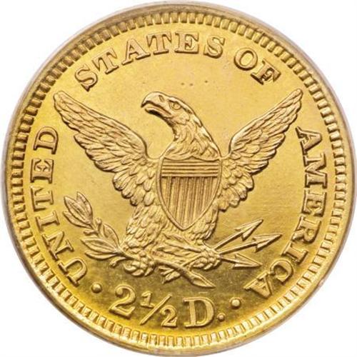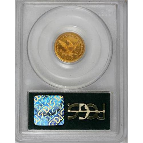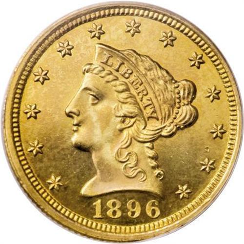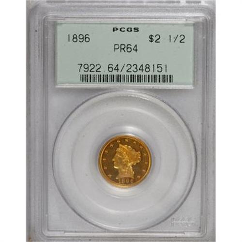 <B>1896 $2 1/2 PR64 PCGS.</B></I> A pinpoint-sharp specimen with flashy fields and rich peach-gold toning. The field above the eagle's head is slightly glossy, but surfaces are nearly unabraded. Encapsulated in an old green label holder. Just 132 proofs were struck. Population: 13 in 64, 14 finer (9/07).<BR><BR><B>Coin Engraver:</B> Christian Gobrecht<BR><BR><b>Shipping:</b> Coins & Currency (<a target="_blank" href="http://www.heritageauctions.com/common/shipping.php">view shipping information</a>)