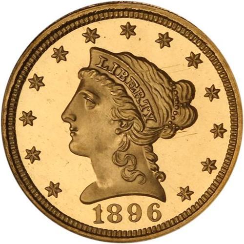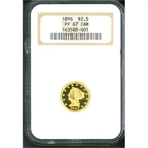 <b>1896 $2.50 Liberty. NGC graded PF67 CAM.</b> NGC #163588001. With a limited original mintage of 19,070 business strikes and 202 Proofs, the 1896 is an understandably scarce coin at all levels of preservation. David W. Akers opines that most survivors are either Mint State or Proof. According to Walter Breen (1988), the specimen strikings are attributable by having the date far to the right in the obverse field below Liberty's portrait. This is just such an example, a starkly glowing gem with cameo finish providing an assurance of Proof status. The fields are deeply reflective with a lovely orange-peel texture, whereas the devices are richly frosted with an almost matte-like texture. Neither side exhibits anything less than needle-sharp striking detail. Free of distractions this coin would serve as a centerpiece in any collection of 19th century Proof gold.