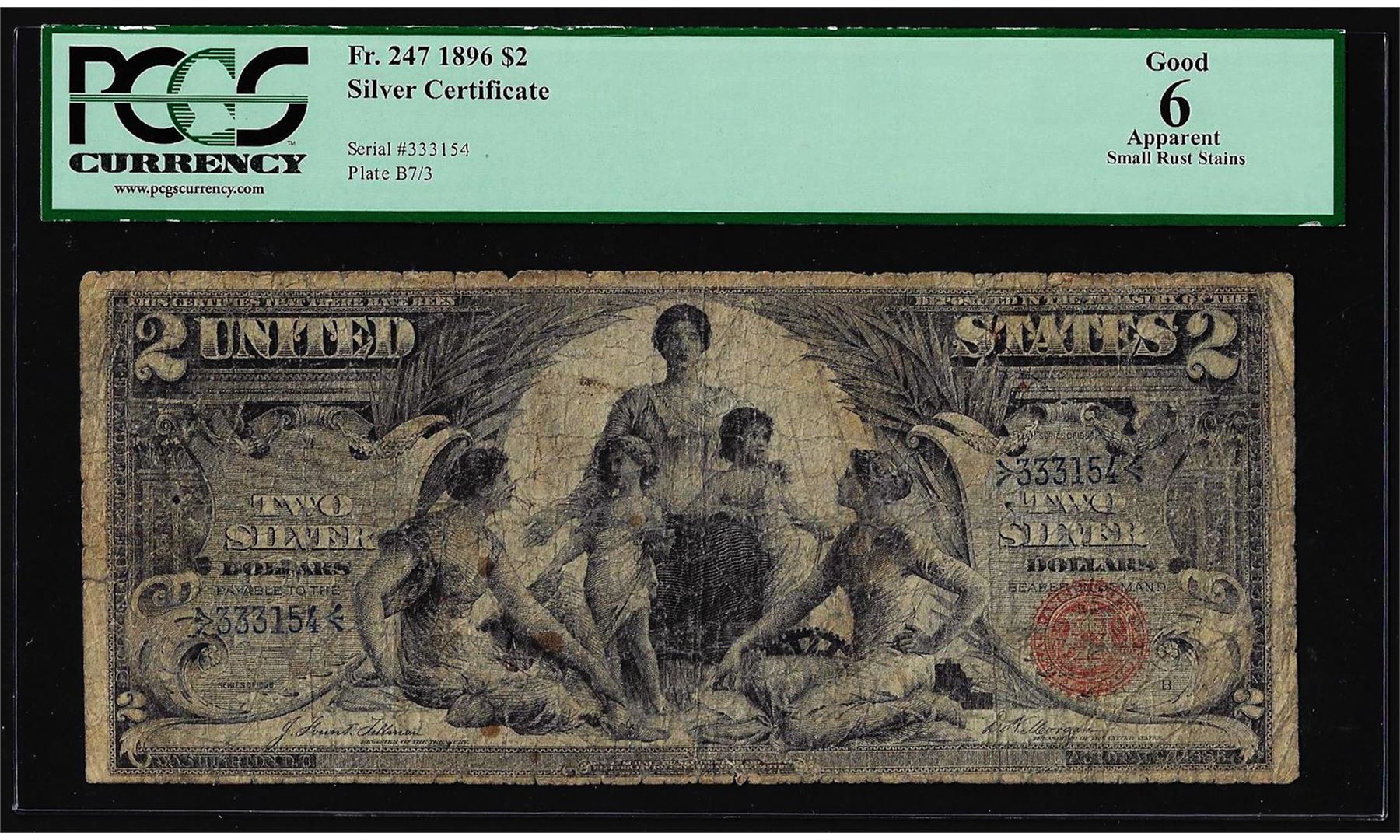 One 1896 $2 Educational Silver Certificate Note Fr.247 PCGS Good 6 Apparent. PCGS Graded.