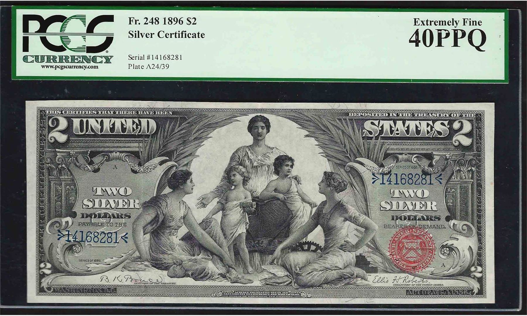 One 1896 $2 Educational Silver Certificate Note Fr.248 PCGS Extremely Fine 40PPQ. PCGS Graded.
