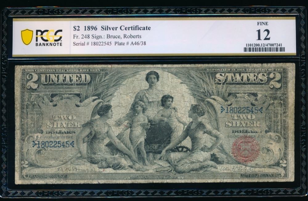 One 1896 $2 Educational Silver Certificate PCGS 12.