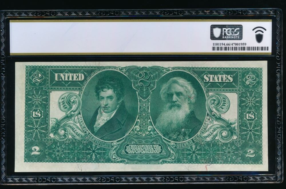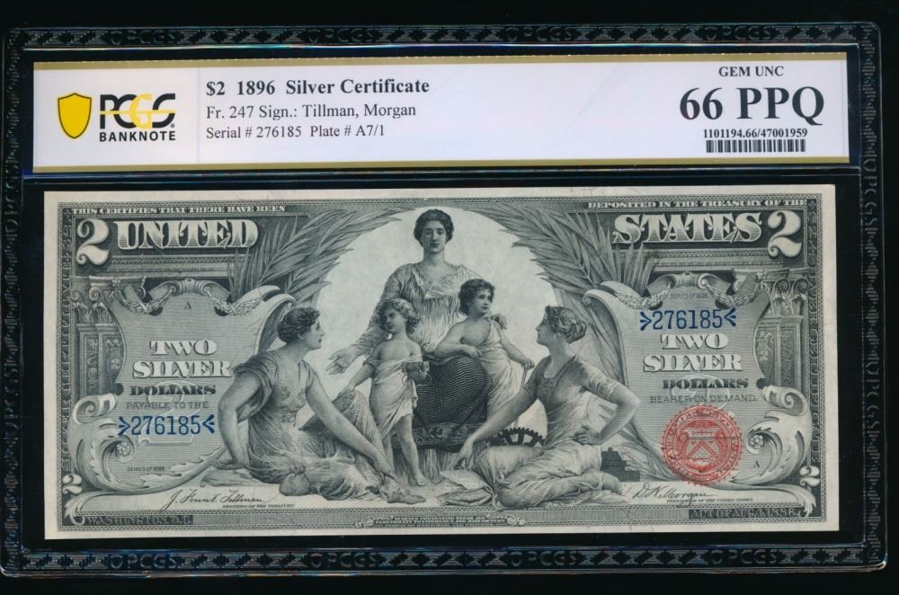 One 1896 $2 Educational Silver Certificate PCGS 66PPQ.