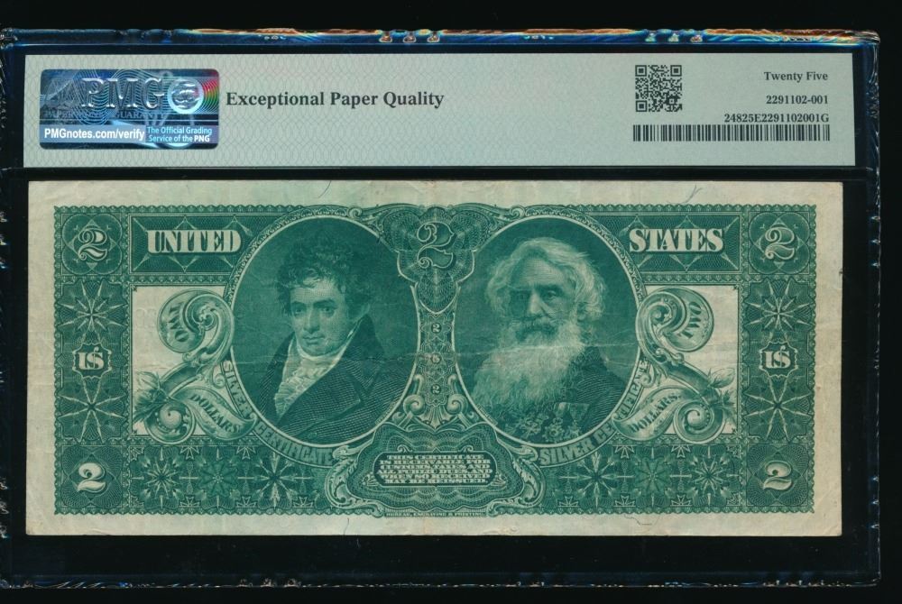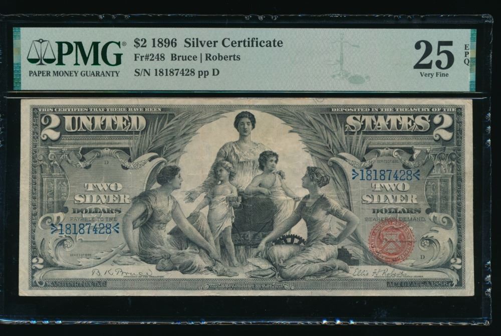 One 1896 $2 Educational Silver Certificate PMG 25EPQ.