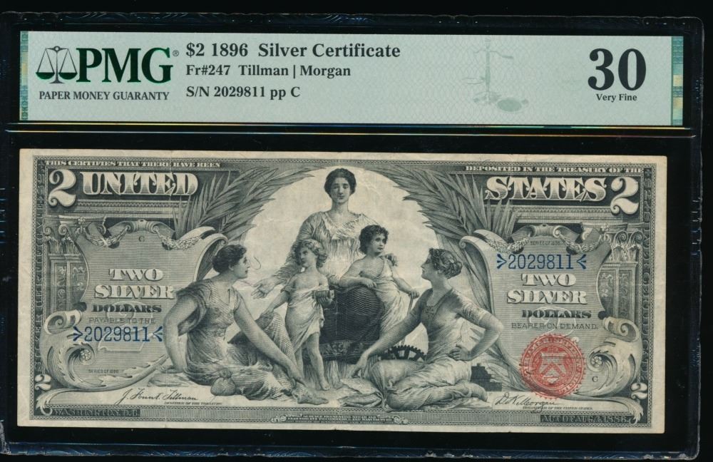 One 1896 $2 Educational Silver Certificate PMG 30.