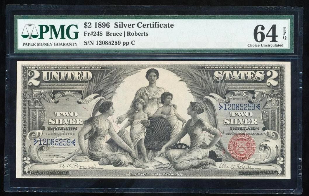 One 1896 $2 Educational Silver Certificate PMG 64EPQ.