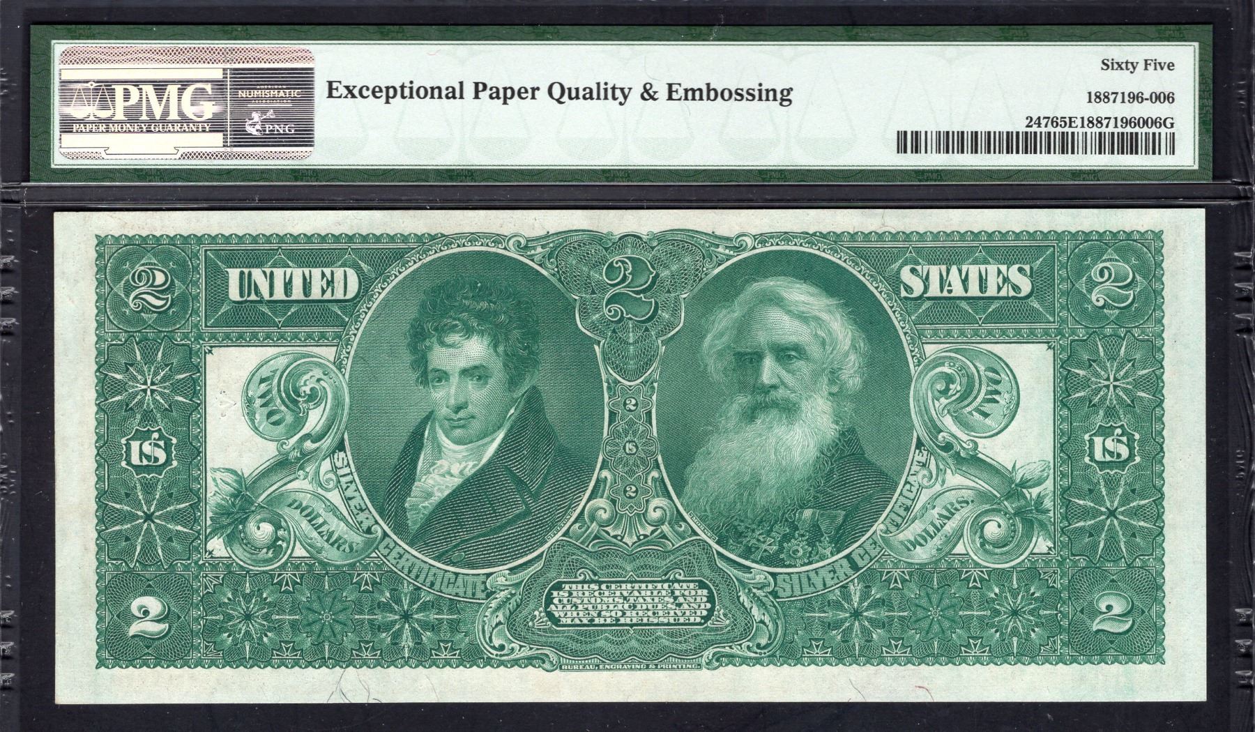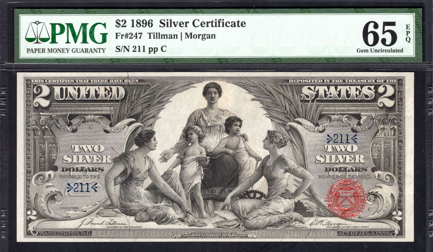 One 1896 $2 Low Serial Educational Silver Certificate PMG 65EPQ.