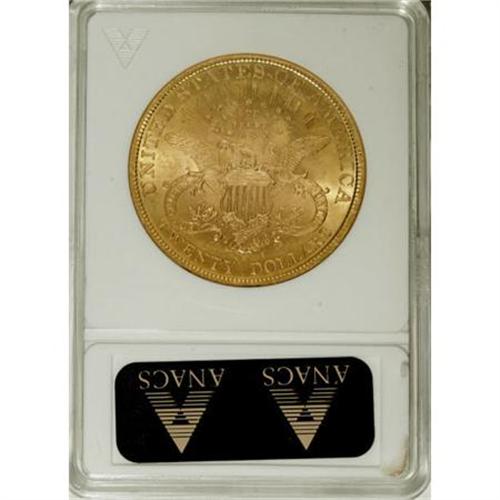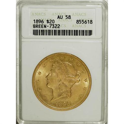 <B>1896 $20 AU58 ANACS.</B></I> Breen-7322. NGC Census: (181/7010). PCGS Population (322/4270). Mintage: 792,500. Numismedia Wsl. Price for NGC/PCGS coin in AU58: $805. (#9029)<BR><BR><B>Coin Engraver:</B> James B. Longacre<BR><BR><b>Shipping:</b> Coins & Currency (<a target="_blank" href="http://www.heritageauctions.com/common/shipping.php">view shipping information</a>)