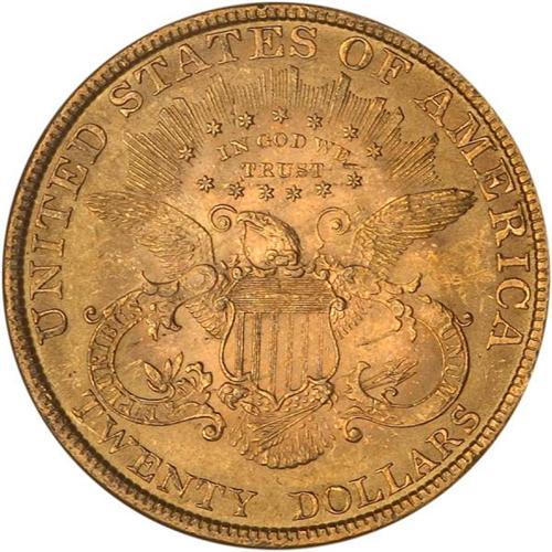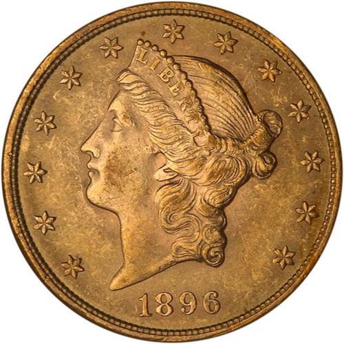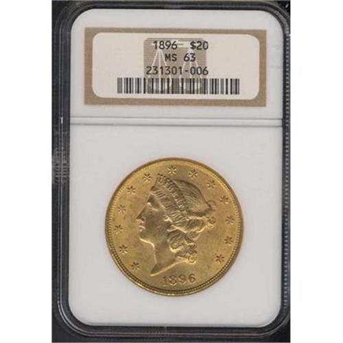 <b>1896 $20 Liberty. NGC graded MS63.</b> A few light bagmarks for the grade. An eye-pleasing coin in this grade. Broadly sweeping cartwheel lustre glows serenely on lightly toned orange matte-like surfaces; at first glance, a higher grade comes to mind <b>(PCGS # 9029)</b> <i>