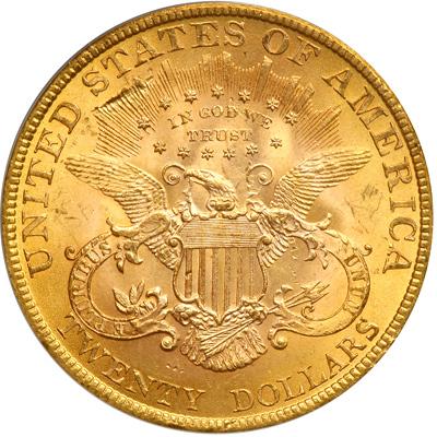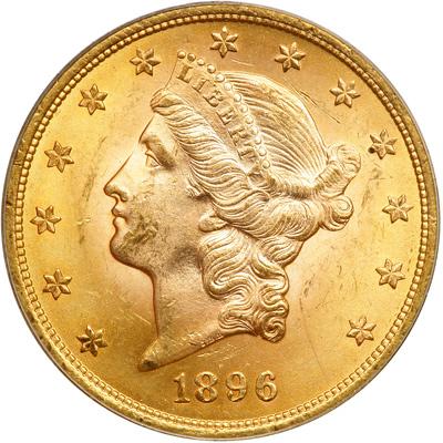 1896 $20 Liberty. PCGS graded MS-62. Rich golden mint luster, though some scuffing on the cheek which takes a point away from the grade (PCGS # 9029).