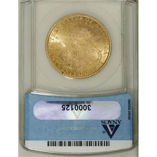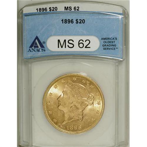 <B>1896 $20 MS62 ANACS.</B></I> NGC Census: (3087/1332). PCGS Population (1873/820). Mintage: 792,500. Numismedia Wsl. Price for NGC/PCGS coin in MS62: $740. (#9029)<BR><BR><B>Coin Engraver:</B> James B. Longacre<BR><BR><b>Shipping:</b> Coins & Currency (<a target="_blank" href="http://www.heritageauctions.com/common/shipping.php">view shipping information</a>)
