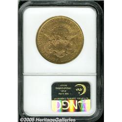 <B>1896 $20 MS62 NGC.</B></I> This coin displays flashy luster and peach-gold patina. The fields show some prooflike characteristics, and offer a mild contrast with the sharply struck design elements. Some grade-limiting marks appear on Liberty's cheek and neck.