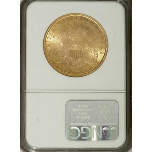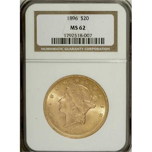 <B>1896 $20 MS62 NGC.</B></I> NGC Census: (3077/1314). PCGS Population (1827/790). Mintage: 792,500. Numismedia Wsl. Price for NGC/PCGS coin in MS62: $755. (#9029)<BR><BR><B>Coin Engraver:</B> James B. Longacre<BR><BR><b>Shipping:</b> Coins & Currency (<a target="_blank" href="http://www.heritageauctions.com/common/shipping.php">view shipping information</a>\)