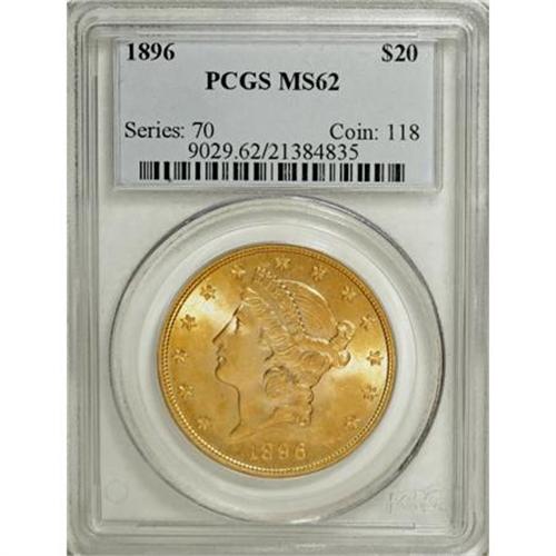 <B>1896 $20 MS62 PCGS.</B></I> PCGS Population (1925/839). NGC Census: (3123/1334). Mintage: 792,500. Numismedia Wsl. Price for NGC/PCGS coin in MS62: $758. (#9029)<BR><BR><B>Coin Engraver:</B> James B. Longacre<BR><BR><b>Shipping:</b> Coins & Currency (<a target="_blank" href="http://www.heritageauctions.com/common/shipping.php">view shipping information</a>)