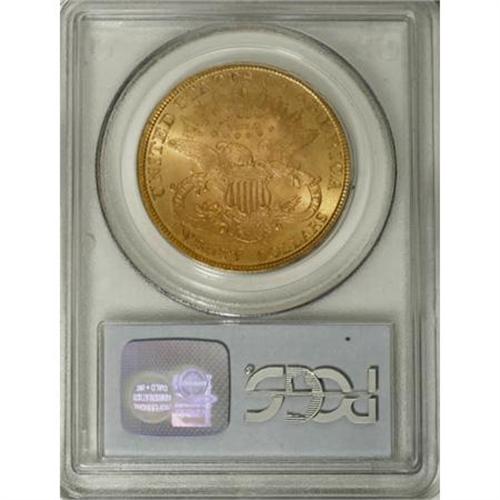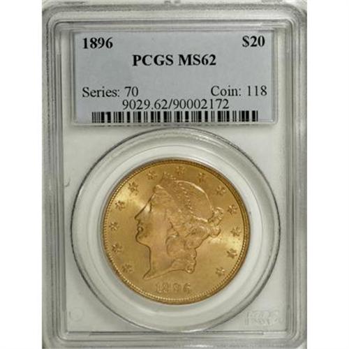 <B>1896 $20 MS62 PCGS.</B></I> PCGS Population (1936/843). NGC Census: (3133/1337). Mintage: 792,500. Numismedia Wsl. Price for NGC/PCGS coin in MS62: $925. (#9029)<BR><BR><B>Coin Engraver:</B> James B. Longacre<BR><BR><b>Shipping:</b> Coins & Currency (<a target="_blank" href="http://www.heritageauctions.com/common/shipping.php">view shipping information</a>)