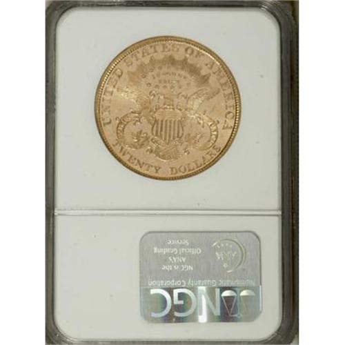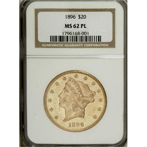 <B>1896 $20 MS62 Prooflike NGC.</B></I> The 896 in the date is repunched. Probably not Breen-7322, since that variety also shows recutting on the 1. The reflective canary-gold fields are abraded, but lack individually mentionable marks. Census: 5 in 62 Prooflike, 1 finer (5/07).<BR><I>From The Vanek Collection.</B></I><BR><BR><b>Shipping:</b> Coins & Currency (<a target="_blank" href="http://www.heritageauctions.com/common/shipping.php">view shipping information</a>)