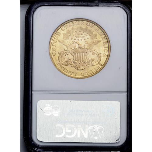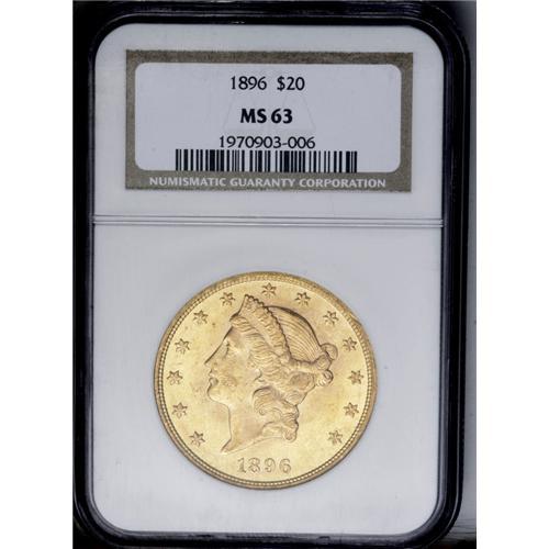 <B>1896<$20> MS63 NGC.</B></I> Frosty luster and a strong strike dominate. Marks are typical for the Select grade, with most of them being scattered over the obverse. The reverse, however, is relatively clean. All in all, a very attractive coin for the grade.